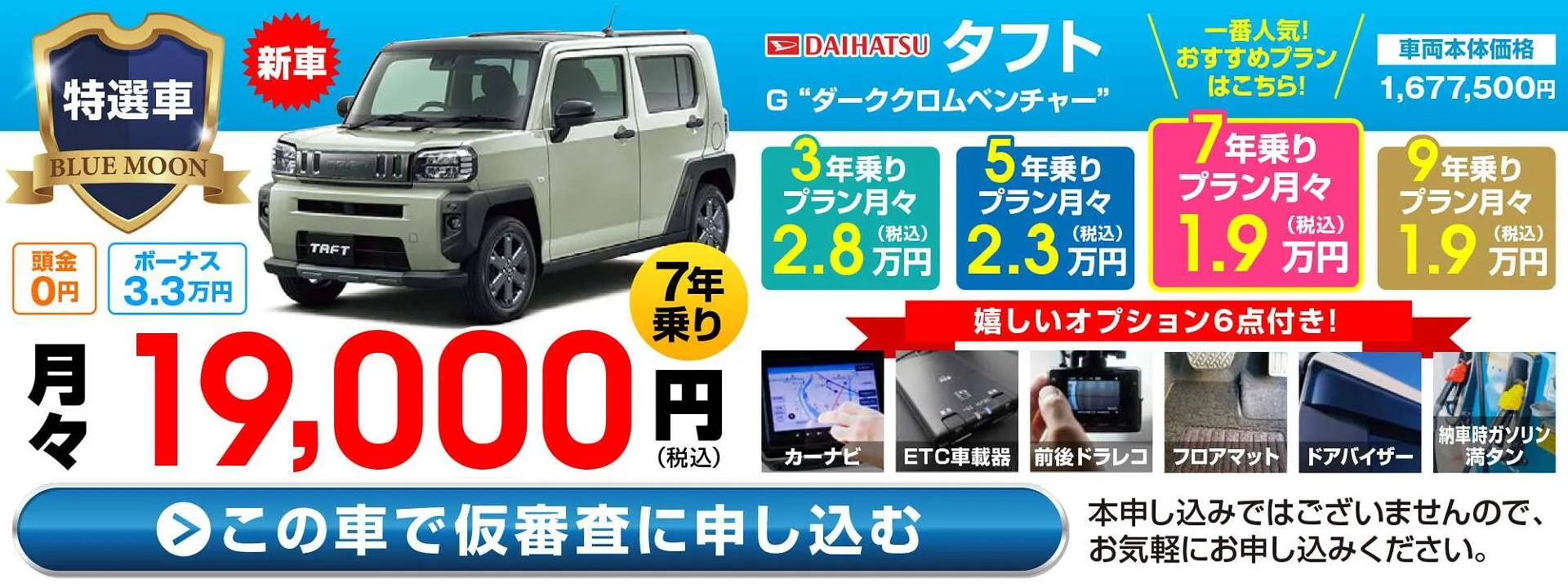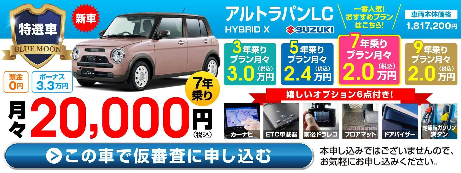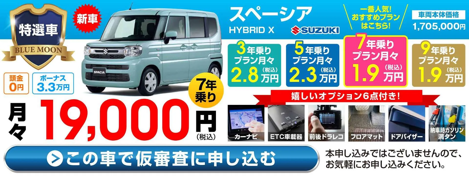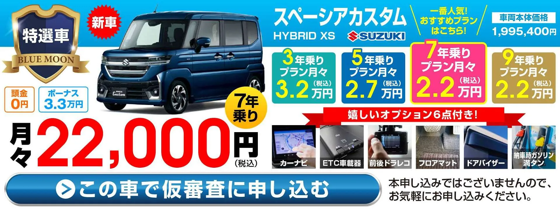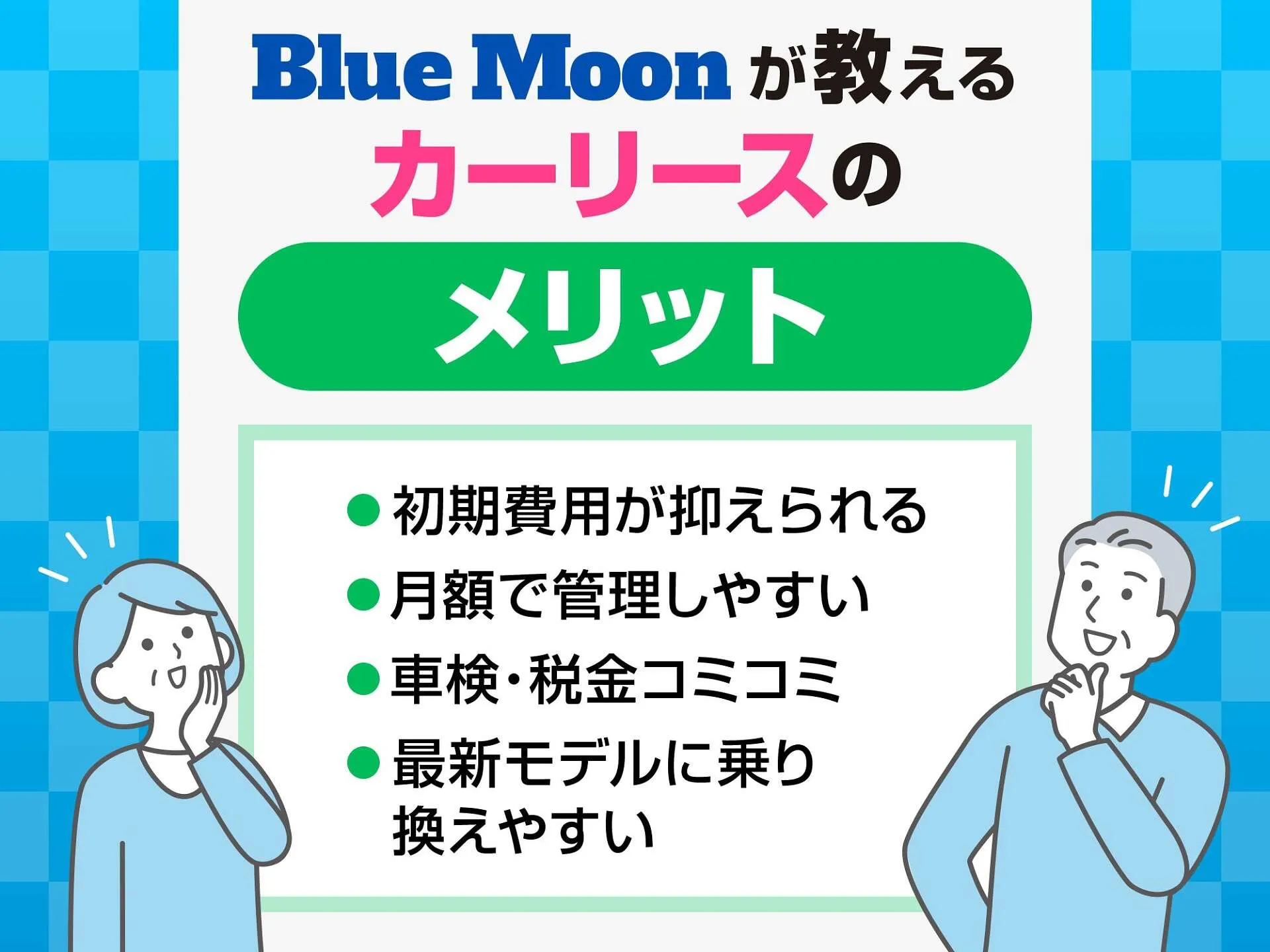 ブルームーンでは最新モデルを100台展示!実際にご覧いただきながらご商談いただけるのが強みです。金利が安いから月々のお支払いも安い!他のリース会社ではできないお乗り換えもライフスタイルに合わせていつでも可能です。