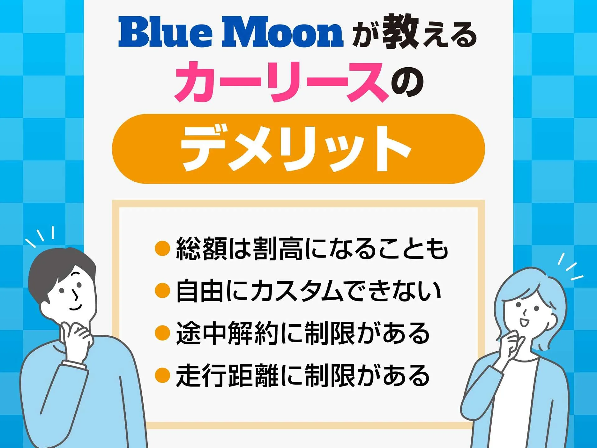 カーリースはメリットもあればデメリットもございます。ブルームーンリースは個人リースが流行りだしたころから取り扱いし、7年以上の実績がございます。当社では専門スタッフがデメリットの少ないカーリースプランを全国のお客様にご案内させていただきます。是非ご利用ください。