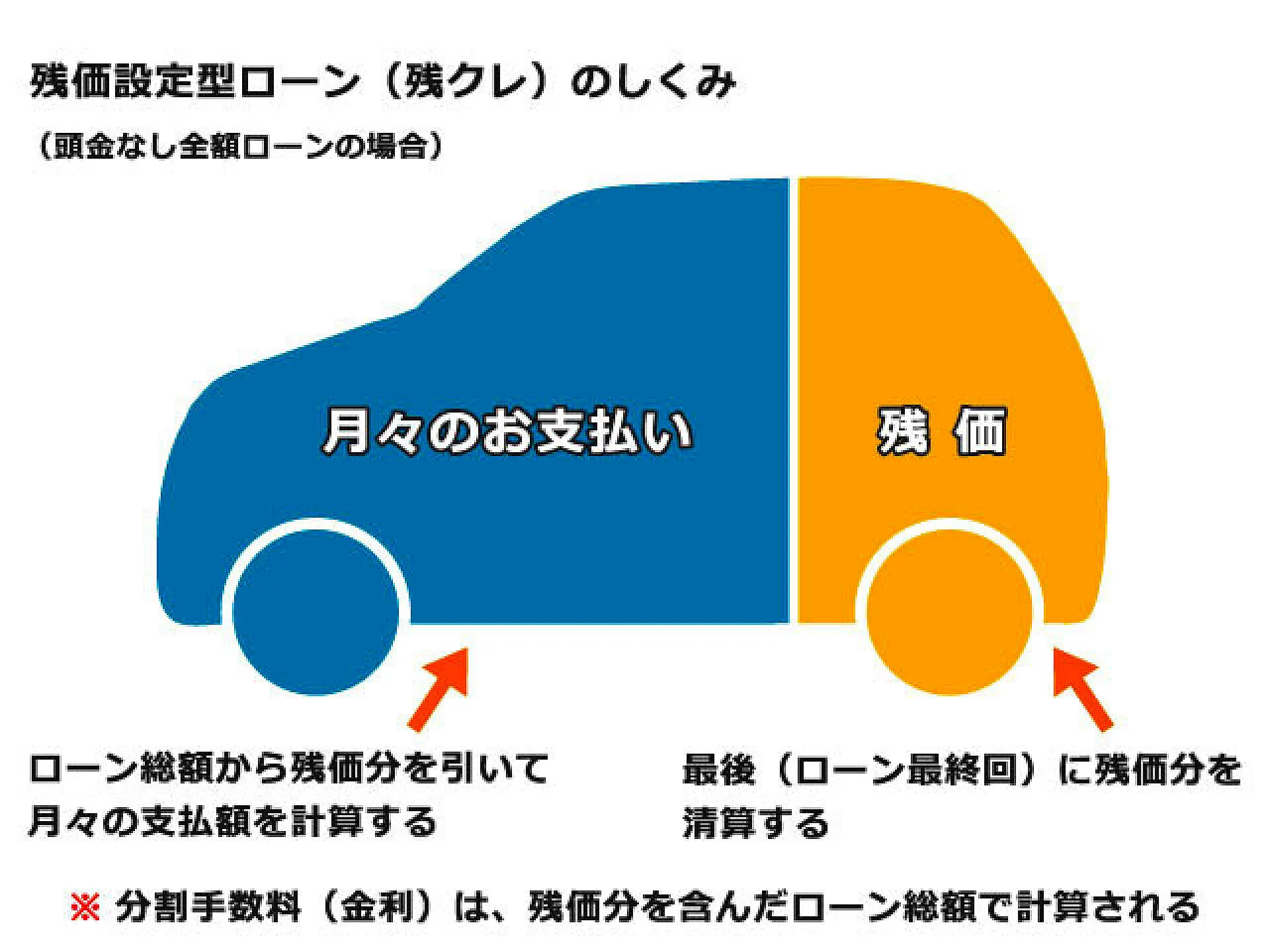 新車は残クレがお得!ローンの契約年数後の車の価値を「残価」として、その残価を車両本体価格から差し引いた額でローンを組みます。(車両本体価格)-(残価)=ローン金額残価となります。最終回のお支払い(契約終了時)には車や残価をどうするかを以下の3つのプランから選ぶことができます。